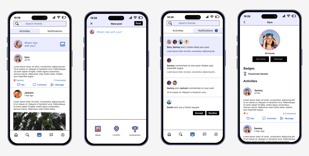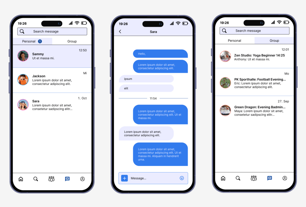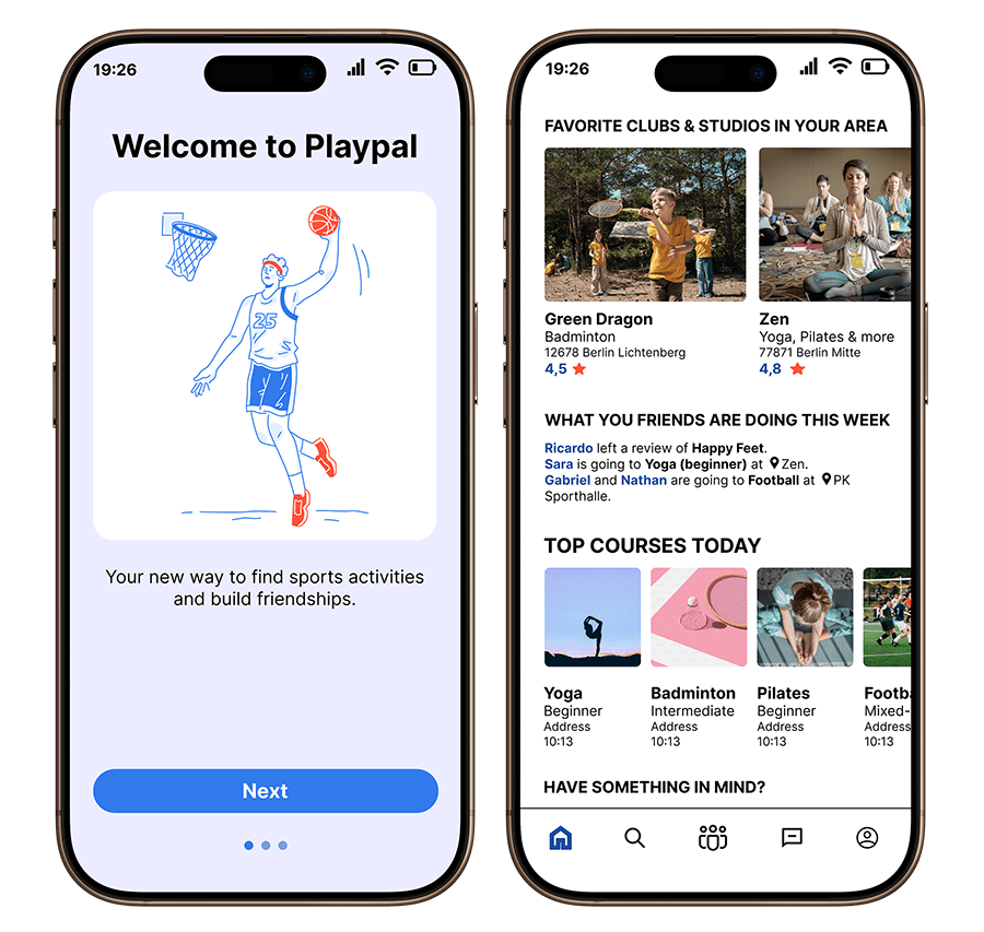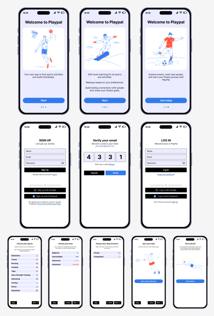 To ensure PlayPal effectively addresses the hypotheses and pain points revealed in the interviews, I designed key features such as centralized event discovery, skill-level and social filtering, post-event social connections, gamification, and location-based suggestions. The app’s main functions include a Homepage with suggestions tailored to user’s location, a Search page with filter options, a Friends feed, and a Messaging system. These features tackle users’ primary challenges, allowing them to confidently explore local sports activities, connect with like-minded individuals, and stay motivated over time.