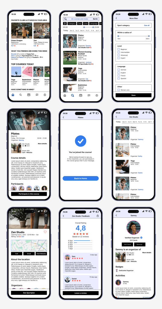 The Homepage displays suggested clubs, studios, and events happening throughout the day. Users can also see which events their friends are attending during the week. By selecting a suggested sport, users can explore available courses and activities.