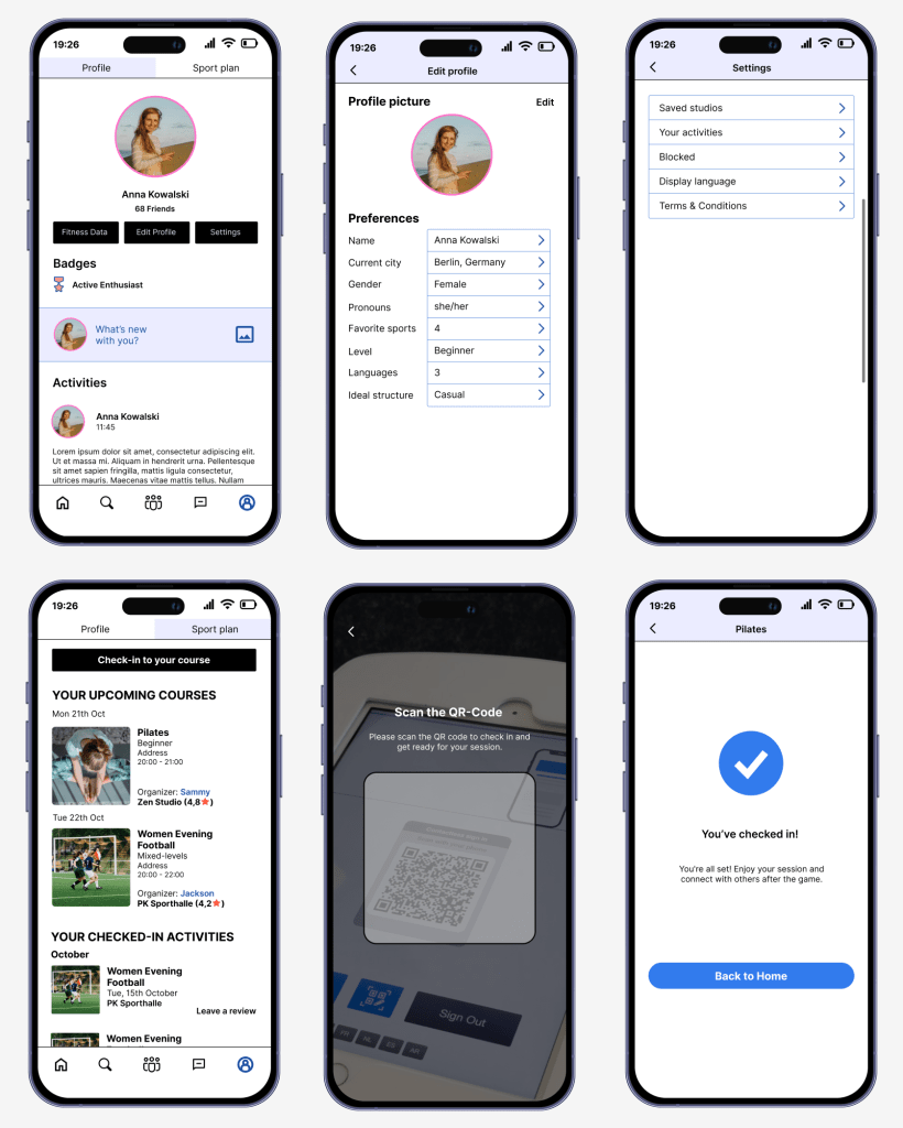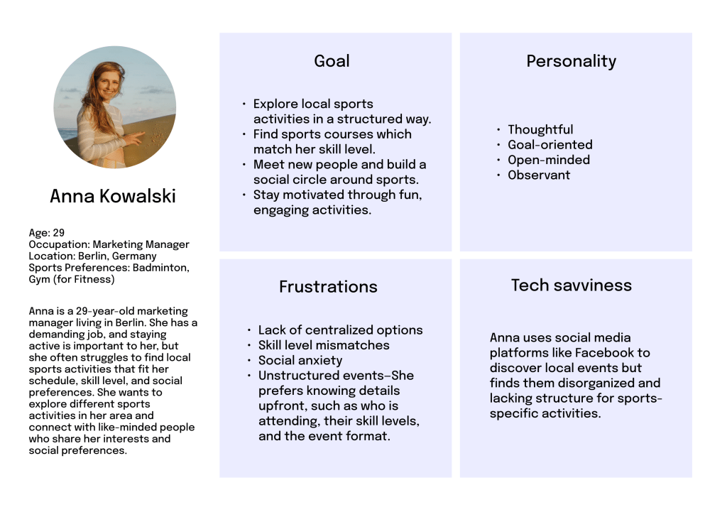 I created the user persona Anna Kowalski based on insights gathered from the people I interviewed. Their feedback helped me understand their habits, challenges, and what they’re looking for in a sports app.