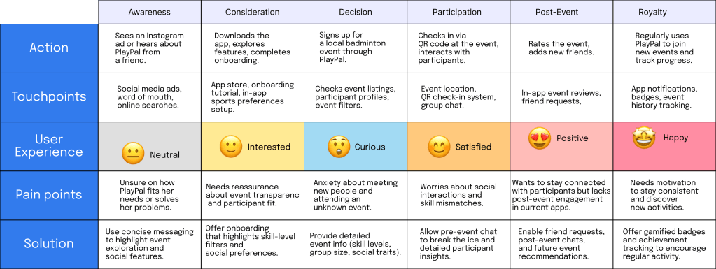 The user journey highlights Anna’s path from discovering PlayPal to becoming a loyal user while addressing her key pain points and solutions.