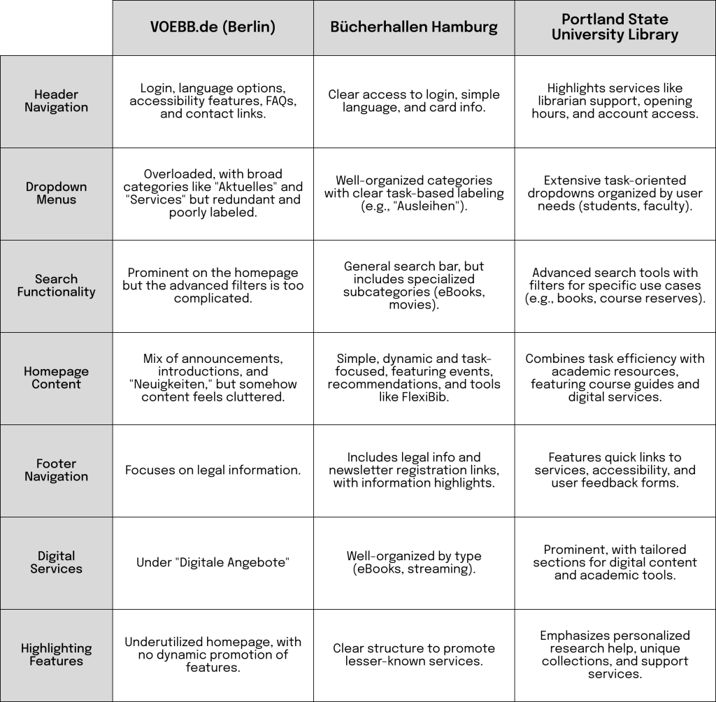 Analyzing the website structures of the Berlin Public Library (VOEBB.de), Bücherhallen Hamburg, and the Portland State University Library highlights differences in usability, navigation logic, and feature discoverability. Each structure has strengths that can inform an improved design for VOEBB.de.