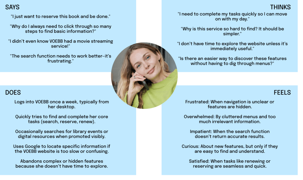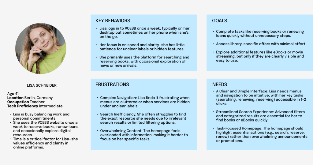 Lisa is a time-sensitive, task-oriented user who values efficiency and simplicity in digital experiences. VOEBB’s redesign must prioritize her key actions (search, reserve, renew) while subtly introducing her to additional features.