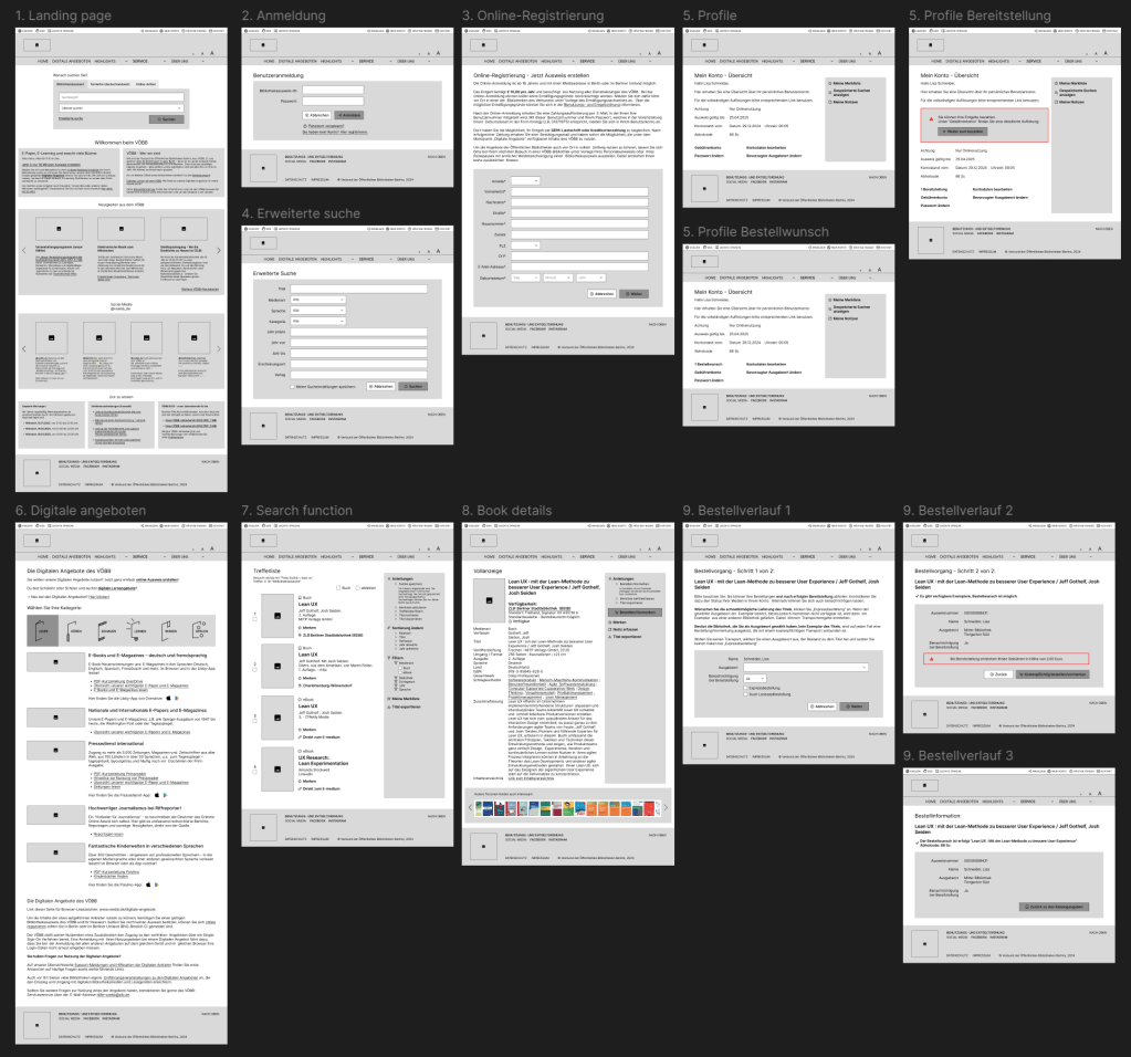Before diving into my high-fidelity prototype, let’s examine the original VOEBB.de website. Through my research and comparative analysis, I found that while the website is not overly complicated compared to standard library websites, its menus and navigation are overwhelming, presenting too much information at once. Additionally, the outdated illustrations hinder users from easily accessing the necessary information.