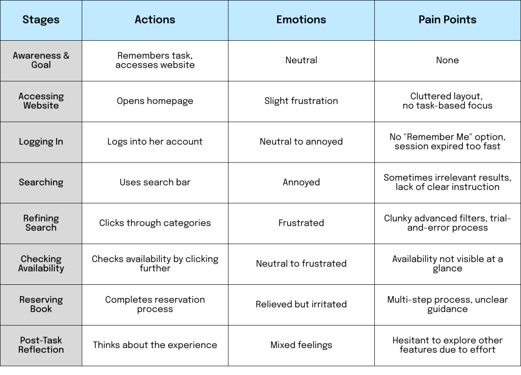 This user journey maps Lisa’s experience as she interacts with the current VOEBB website to complete her primary task: reserving a book at a nearby library. It highlights her actions, emotions, and pain points at each stage.