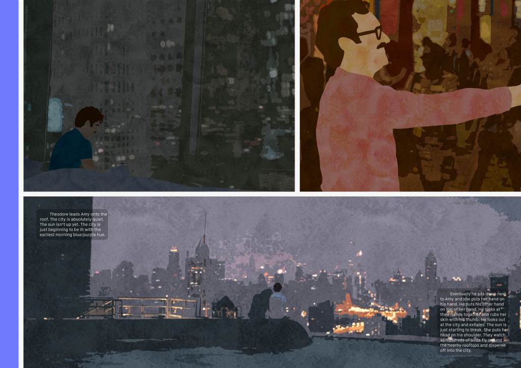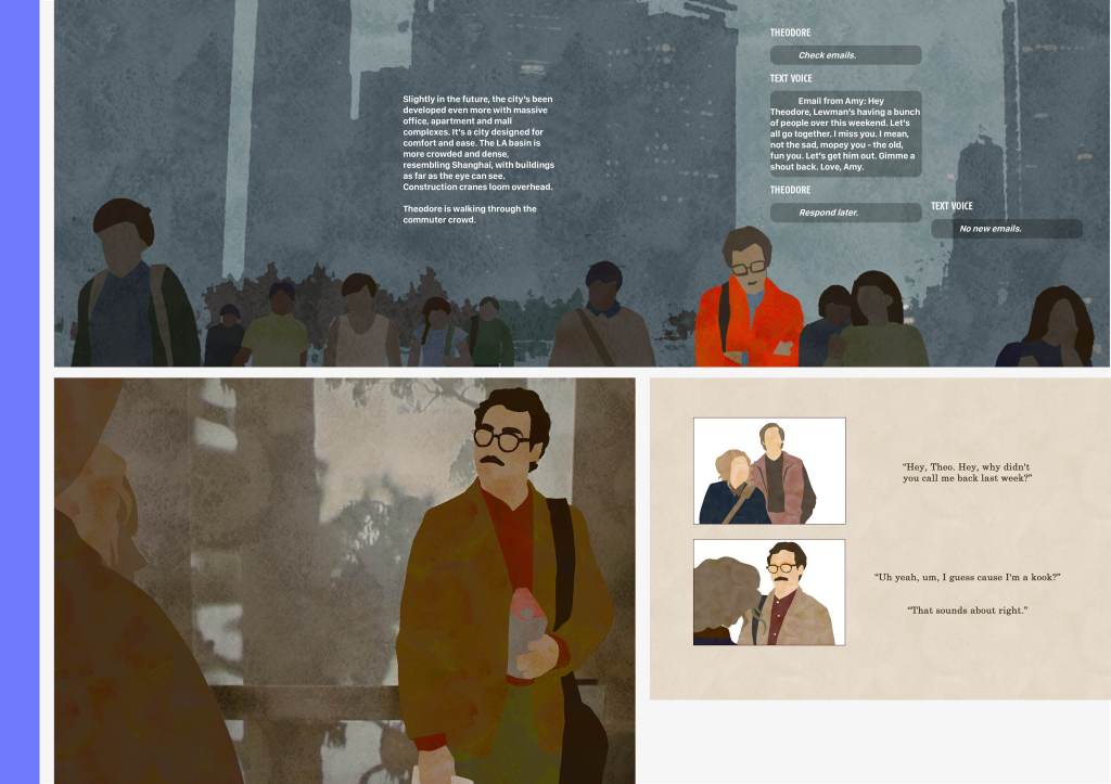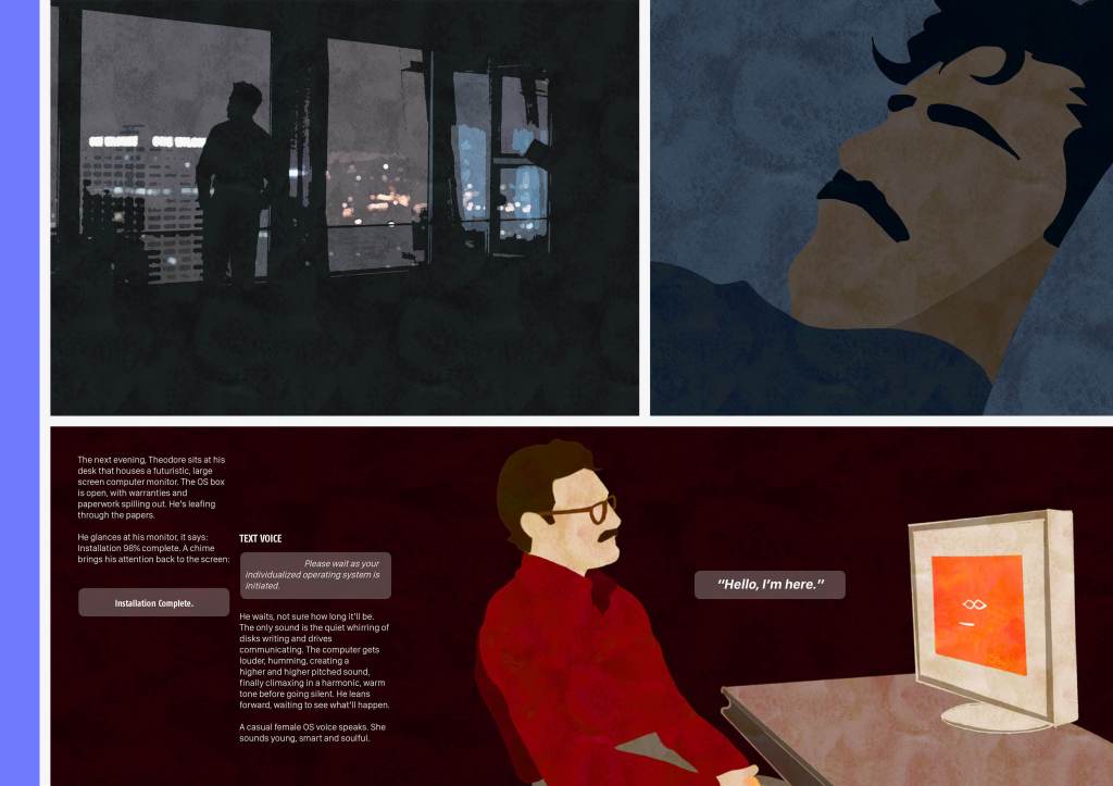 Through this project, I was granted the chance to conceive and design a book on a subject of my choice. After careful deliberation, I opted to create an illustrated book centered around the film “Her” (2013), directed by Spike Jonze. Working with Photoshop, I crafted all the illustrations, while using InDesign to integrate typography elements. This project marked my first experience assuming end-to-end responsibility, encompassing all aspects
